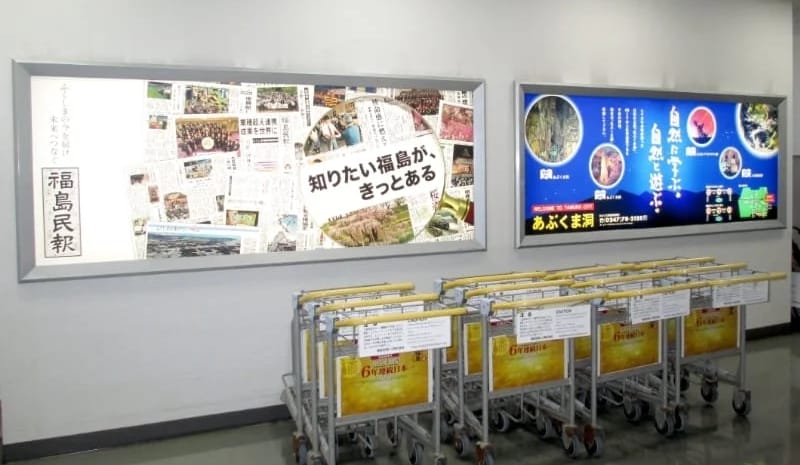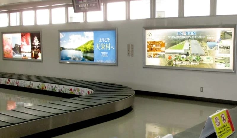 福島空港内広告の中でも、プラットホームや中階・通路等の壁面・階段・柱に設置されている広告等の大型電飾広告は、人々の目を集め易い媒体です。
